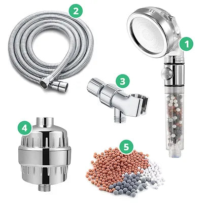 StoneStream® shower heads and filters fit all shower types. We offer a wide range of kits to fit each purpose. You can order a full shower kit or a shower filter separately (Handheld, fixed, combo shower heads, replacement stones and cartridges available). In the image you can see the 5 items included in our Hard Water Filtration Kit which is everything you need in order to transform your shower.